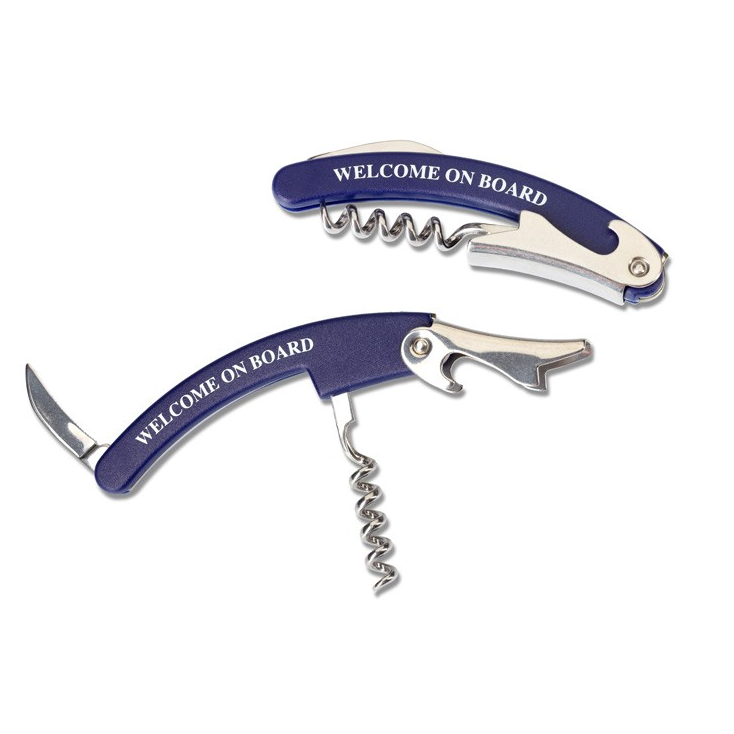 Witte Welcome on Board Bier- en Flessenopener. Op deze opener staat de tekst ”Welcome on Board”. Voor het openen van wijnflessen en bieflessen. Tevens voorzien van een klein uitklapbaar snijmesje.