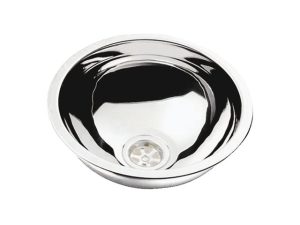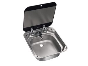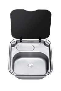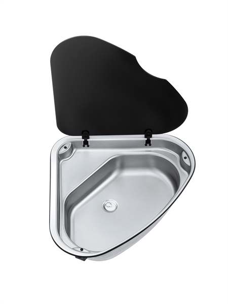 Driehoekige RVS wasbak met afdekplaat.