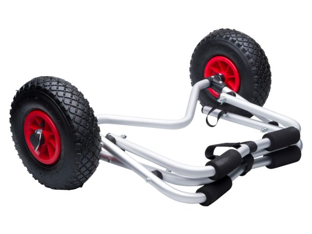 Deze transportkar maakt het vervoeren van uw kajak, kano, SUP, of surfplank eenvoudig. Door het sterke aluminium frame heeft de transportkar een maximaal draaggewicht van 75kg en is hij zeer goed bestand tegen corrosie. Het frame heeft een V-vorm met hierop foam rollen, dit zorgt naast bescherming ook voor maximale grip en stabiliteit tijdens het gebruik. De trolley beschikt over opblaasbare banden met een diameter van 28cm, hierdoor begeeft hij zich eenvoudig over ruw terrein. Na gebruik klapt u de trolley eenvoudig op tot een compact formaat en kunt u zelfs de wielen zonder gereedschap d.m.v. quick-release pennen verwijderen, waardoor hij eenvoudig op te bergen is. Wordt geleverd inclusief spanband.