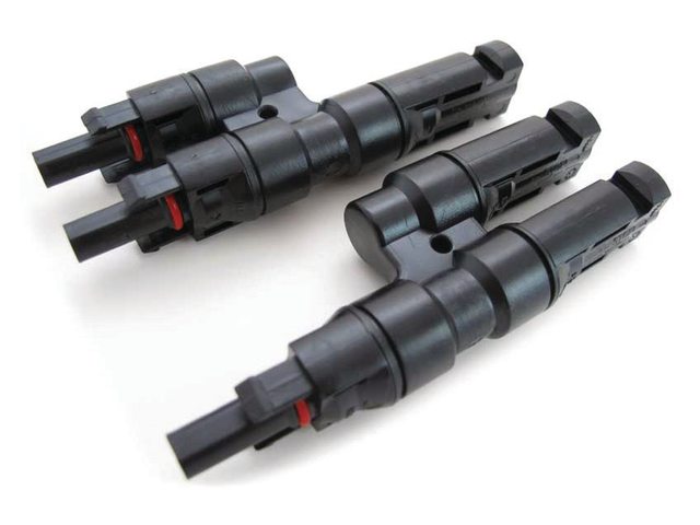 Een adapter en splitters voor het aansluiten/verbinden van zonnepanelen.