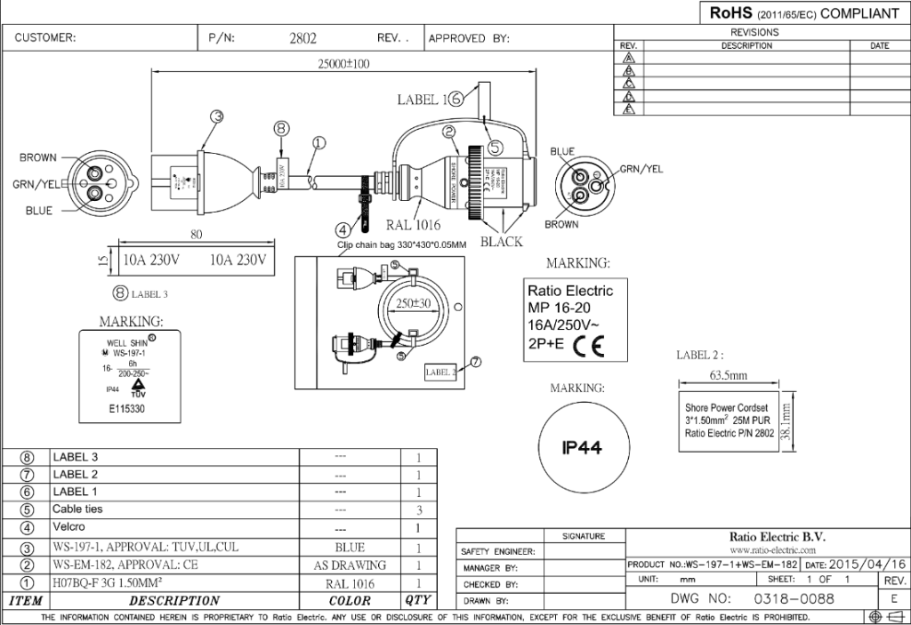 Ratio Electric walstroom kabels met gele PUR kabel en aangespoten connectoren bieden de beste kwaliteit voor uw boot, camper of caravan. De aansluitkabel is van PUR en heeft twee aangespoten stekers. Deze aangespoten stekers garanderen waterdichtheid en een lange levensduur. De bootsteker heeft een bajonetring voor waterdichte verbinding met de inlet en is voorzien van een spanningsindicatie en beschermdeksel.