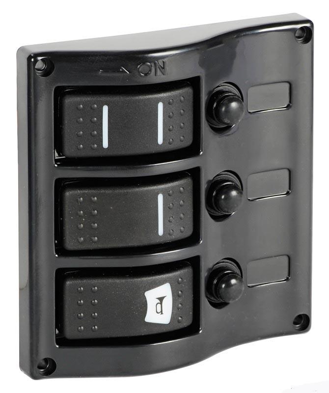 Schakelpanelen met thermische zekeringen en led verlichting.