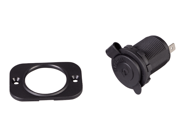 Rond 12V Inbouwstopcontact met afdekkap en extra rechthoekige montage plaat. Maximaal 20A @ 12V.