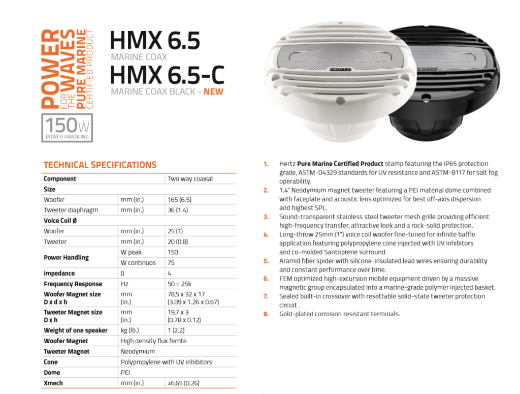 De HMX 6.5 hi-performance marine coaxiale luidsprekers zijn ook beschikbaar in de zwarte optie HMX 6.5-C, is geoptimaliseerd om te presteren voor het perfecte geluid, met een solide bas en een uitstekende output. De tweeter heeft een akoestische lens die is geoptimaliseerd voor de beste off-axis dispersie en maximale SPL. Het aantrekkelijke roestvrijstalen tweeter-rooster biedt perfecte hoogfrequente overdracht en een oerdegelijke bescherming. De uv-bestendige polypropyleen kegel samen met de mand en het rooster is geïnjecteerd met een hittebestendig en uv-bestendig polymeer, dit neutraliseert water, stof en modder.