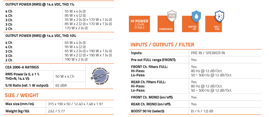 4 Ch: 65 W x 4 (4 Ω) 4 Ch: 95 W x 4 (2 Ω) 3 Ch: 65 W x 2 (4 Ω) + 190 W x 1 (4 Ω) 3 Ch: 95 W x 2 (2 Ω) + 190 W x 1 (4 Ω) 2 Ch: 190 W x 2 (4 Ω) |