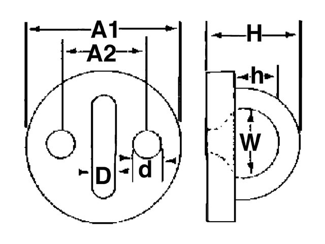 | Artikelnummer | D mm | A1 mm | A2 mm | H mm | h mm | W mm | Ø d mm |