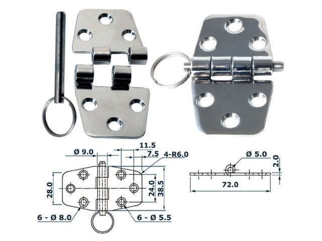 RVS Scharnier met uitneembare pin. Afmetingen (mm): 72×38.5 Dikte (mm): 2.0