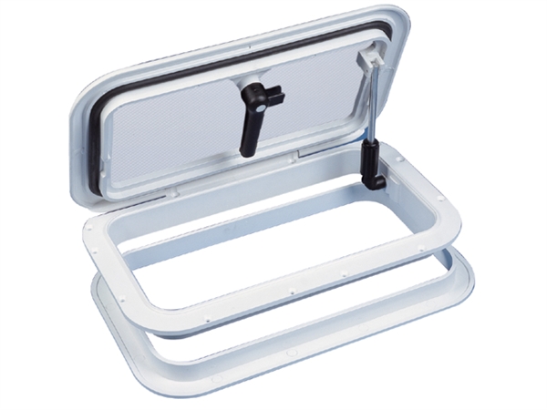 Wit kunststof dekluik voorzien van uitzetter en knevel. Alleen van binnen te openen. Laag profiel (Hoogte 2cm) Deksel uitgevoerd met witte rand en acrylaat.