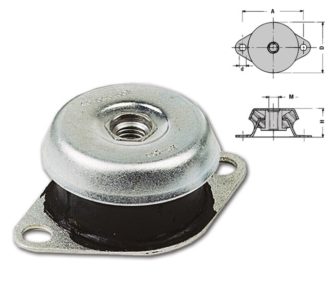 | Type nr. | Max. belasting (kg) | Stijfheid (N/mm) | D (mm) | A (mm) | H (mm) | d (mm) | M | Art.code |
