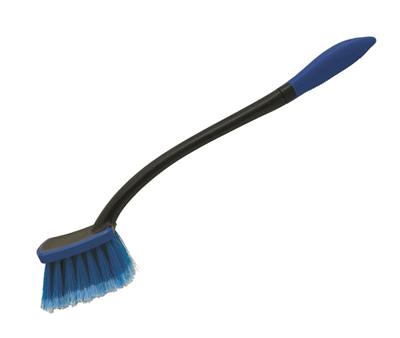 Een hand wasborstel met een lange steel, rubberen rand tegen krassen en zachte haren.
