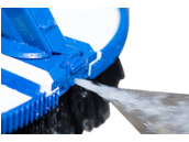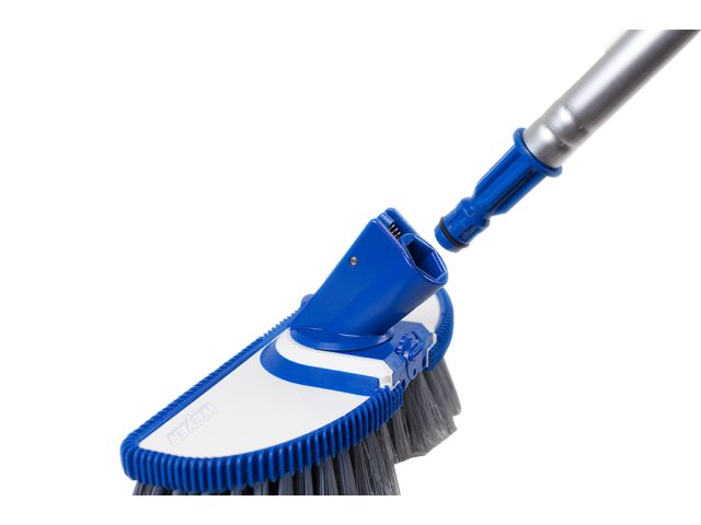 Allround innovatieve borstel met waterdoorloop. De borstel is eenvoudig te koppelen op de bijbehorende stelen met waterdoorloop en is 360° draaibaar en in vier posities vast te vergrendelen, zeer makkelijk voor de smallere gangboorden of smalle plekken om goed te kunnen reinigen. In de kop van de borstel zitten tevens twee spuitkoppen, een met een smalle sterke straal en een met een brede straal, boenen en afspoelen is hierdoor nog eenvoudiger. De borstel is voorzien van een stevige rubber bumper om schade te voorkomen. De borstel is leverbaar in 3 hardheden zodat er voor elke ondergrond een passende borstel is, van romp tot antislip dek.