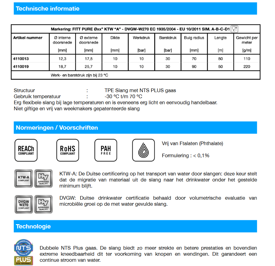De Fitt Pure is een KTW-A en DVGW W270 gecertificeerde waterslang en voor andere vloeibare voedingsmiddelen. Deze slang voldoet aan de Europese richtlijnen EC 1935/2004 & EC 10/2011. De certificering is uitgevoerd door German Hygiene- Institute Laboratory. Eveneens te gebruiken in de toevoer van drank naar kranen bij kroegen, beurzen en evenementen.